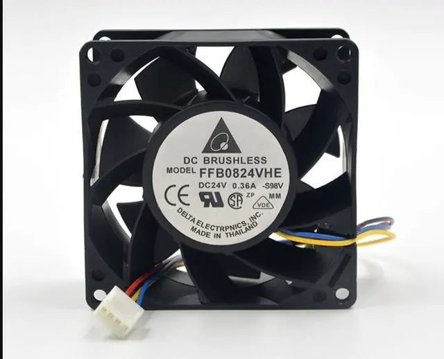 :DeltaModel : FFB0824VHEDimensions : 80X80X38MM [ 8038 ]Voltage : 24VCurrent : 0.36ASpeed : 4500 RPMAir flow : 56.02 CFMPressure : 0.492 IN H2ONoise : 45 d-BABearing : Dual ball bearingLead : 3-wireMaintaining optimal continuous operating time of 180,000 hoursFeatures : Maintenance- double ball bearing , long service life , with plenty of cooling air volume and pressure .Application: chassis cooling , CPU cooler, the transmation of the power supply fan , water cooling auxiliary , gaming heat, high reliability server application places.