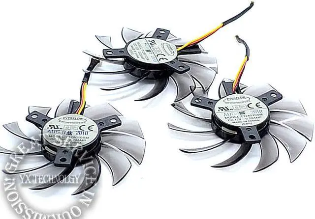 GTX460 470 570 580 670 HD5870 Graphics card fan T128010SM 5P plug 12V 0.20A 75mm diameter 3pcs/setModel : T128010SMVoltage : 12VCurrent : 0.20AMPInterface: 5 line cardSize: 75mm diameter hole distance 40mm fanSpeed : 3500RPMWind : 23CFMNoise : 25DBLife: 30,000 hoursBearings : EBR ( hydraulic one )