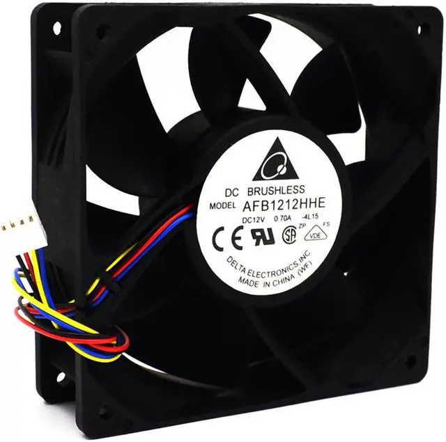 : DELTA?Fan size? 120 * 120 * 38 mm?Fan Model? AFB1212HHE[Voltage range] DC 6.0V ~ 12.8V?Nominal voltage? DC 12V[Nominal current] 0.70A?Input current? 0.51A?Input power? 6.12W?Rated speed? 3500 R.P.M.[Noise] 47.0 dB-A[Motor bearing type] Double ball bearing[Air volume] 130.80 CFM (cubic feet per minute) = 3.704 m?3; / min (cubic meters / minute)?Wind pressure? 11.48 mmH2O (mm / water column) = 0.452 inH2O (inches / water column)?Fan net weight? 320g bearing: precision double ball bearing