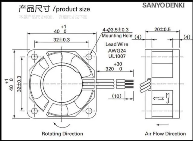 Model: 109P0424H6D23Size: 40 * 40 * 20mmVoltage: DC24VVoltage range: 12V-28VCurrent: 0.07ASpeed: 7400rpmAir volume: 26.8cfmNoise: 16.5dbPower: 1.68WWorking temperature: -10 ° C-70 °CBearing: maintenance- double ball bearingsLife: 25 ° expected life of 35000hUses: inverter cooling, chassis, power supply, server and other equipment cooling purposes. The TheFeatures: overwhelming long working life, 180,000 hours of the average time between failures; no compromise high-precision high-quality parts structure.Life: 8.0000 hours (25 °, 45 ~ 85% relative humidity environment)Fan frame: injection molding, PBT + 30% glass fiber + VO grade flame retardant;Fan: injection molding, PBT + 30% glass fiber + VO grade flame retardant;Fan rotation: counterclockwise from fan blade;Operating temperature: -10 degrees Celsius to +70 degrees Celsius;Storage temperature: -40 degrees Celsius to +70 degrees Celsius;Bearing: high-precision ball bearings;Power supply range: plus or minus 15% of rated power supply;Insulation resistance: greater than 500 megohms;Withstand voltage: drain current 0.5mA 500V / 1 minute;Working life: ambient temperature of 25 degrees when 80,000 hours