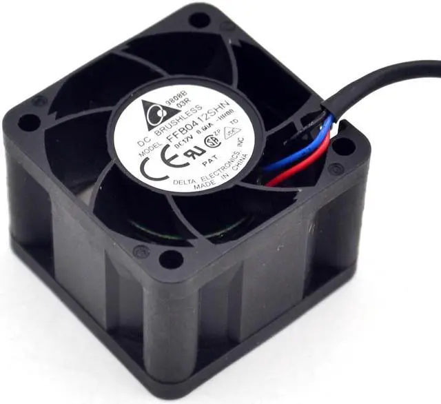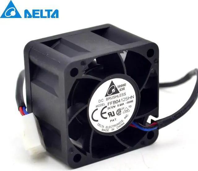 []:Delta[ Fan Model ]: FFB0412SHN[ Dimensions ]: 40 × 40 × 28mm[ Rated voltage ]: DC12V[ Voltage Range ]: DC7.0V-13.6V[ Input Power ]: 0.6 A[ Rated speed ]: 8700 r.p.m[ Temperature Range ]: -10 .. 70 ° C[ Life expectancy ]: 25 ° C when the life expectancy of 50,000 hours L10[ Bearings] : Maintenance- double ball bearing[ Rotation] : air discharged from the stent , in the face of the rotor counterclockwise rotation[ Maximum air volume ] : 43CFM[ Motor Protection ] : overload , wrong level protection and stall protection locks flow[ Minimum pressure ]: 110 Pa[ Noise index ]: 40 dB (A)[ Material Material ] : Glass fiber reinced plastic , PBT housing , PA blade[ Function Description ] : E external rotor DC fans, complete electronic commutation componentsThree -line stall warningFour-wire PWM: