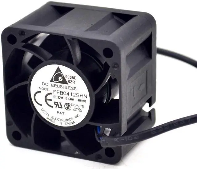 [ ]: Delta[ Fan Model ]: FFB0412SHN[ Dimensions ]: 40 × 40 × 28mm[ Rated voltage ]: DC12V[ Voltage Range ]: DC7.0V-13.6V[ Input Power ]: 0.6 A[ Rated speed ]: 8700 r.p.m[ Temperature Range ]: -10 .. 70 ° C[ Life expectancy ]: 25 ° C when the life expectancy of 50,000 hours L10[ Bearings] : Maintenance- double ball bearing[ Rotation] : air discharged from the stent , in the face of the rotor counterclockwise rotation[ Maximum air volume ] : 43CFM[ Motor Protection ] : overload , wrong level protection and stall protection locks flow[ Minimum pressure ]: 110 Pa[ Noise index ]: 40 dB (A)[ Material Material ] : Glass fiber reinced plastic , PBT housing , PA blade[ Function Description ] : E external rotor DC fans, complete electronic commutation componentsThree -line stall warning3-wire PWM