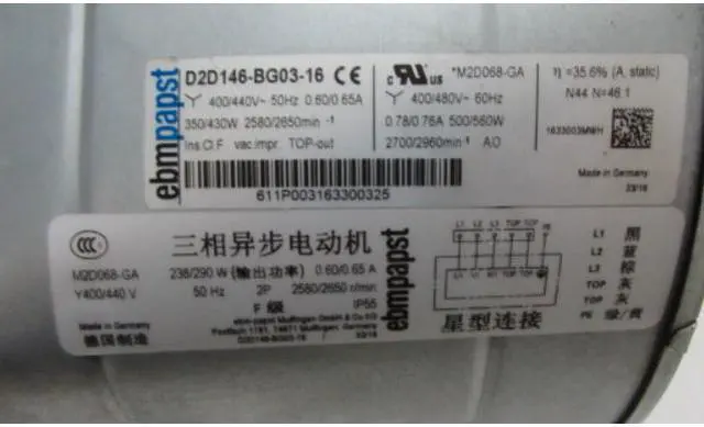 Motor M2D068-GANominal voltage / VAC 440/ 480Nominal voltage range / VAC380 .. 440/ 380 .. 480 Wiring Y Frequency / Hz 50 /60 Speed (rpm) / min-1 2580/ 2700/ 2650/ 2960Power consumption / W 350/ 500 /430/ 560Current draw / A 0.6 /0.78 /0.65/ 0.76Min. back pressure / Pa 290/ 315 /300 /385Min. ambient temperature / °C-25Max. ambient temperature / °C60Detailed ImagesApplication industry Beijing Henry stock D2D146-BG03-16 Schneider inverter fan, original authentic, price concessions, off the shelf.D2D146-BG03-16 is a Schneider inverter fan. The large fan at the bottom of the Schneider inverter is used to dissipate heat from the high-power components such as the IGBT of the inverter. The small fan is used to dissipate the electronic components such as the CPU board, the driver board, and the power board. of. If the fan has a problem, it will cause a malfunction to the Schneider inverter, so it is very important to choose a genuine original fan. D2D146-BG03-16 is the original fan of Schneider inverter fan. The fan has compact structure, long service life and energy saving. D2D146-BG03-16Fans reduce the maintenance cost of Schneider inverters and increase the reliability and durability of the inverter, which makes it more energy efficient and more efficient in use.D2D146-BG03-16 Schneider inverter fans are widely used in the application industry, whether it is automobile manufacturing, battery production, chemical industry, cement plants, cranes, machinery manufacturing, shipbuilding, mining, oil and gas exploration, cabinets, logistics and The airport, water industry and pharmaceutical industry are inseparable from the ventilation and heat dissipation of Schneider inverter fans.As a 12-year-old wind turbine dealer, Henry has the corresponding fan models, such as ABB inverter, Siemens inverter, Schneider inverter and other inverters, and there are a large number of stocks, the price is beautiful, all are brand new. Original authentic, please rest assured to buy.Beijing Henry has been operating fans for decades, and its products have gathered the world's top wind turbine brands, and have been officially authorized by Germany's three giant wind turbines (ebmpapst, mdexx, wistro) manufacturers! Fan application fields are wide, including ABB inverter fan, Siemens Robincon inverter fan, Siemens servo motor fan, Schneider inverter fan, rail traffic fan, high-voltage inverter fan, FFU/AHU special fan, wall-mounted furnace fan, wind power counter Converter fans, cold chain supermarket fans, condensing gas blowers, car bus fans, data center fans are our superior products, and other industries cover a wide range of applications. Beijing Henry can also provide you with IP68 high protection level, high wind pressure, long life and miniature fan. Technical engineers can select the fan and provide complete fan solution. Our fan accessories are complete, we can also process the fan casing, welcome customers to come to consult!In addition to the Schneider inverter fan, Beijing Henry also provides a large number of other inverter fans. Some models can refer to the following table. For other models, please contact our staff. We will be enthusiastic and patient. You answer questions, welcome customers to inquireCentrifugal fansCentrifugal fans from ebm-papst are available with forward- or backward-curved blades. The low-noise centrifugal fans with forward-curved blades are also supplied with a scroll housing. The centrifugal fans with backward-curved blades are designed as free-wheeling fans and do not require a scroll housing. For the centrifugal fans with external rotor motors, the motor is positioned in the impeller, resulting in optimum cooling of the motor as well as an especially compact design. The entire product line is available in both AC and GreenTech EC technology.Advantages of the ebmpapst fan 1) Air flow up to 35000m3 / h2) Sturdy steel plate3) Compact design of external rotor motor4) Forced electronic cooling5) Suitable for a variety o