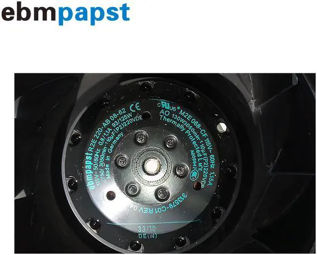 Motor M2E068-CFPhase 1~ 1~ 1~Nominal voltage / VAC 115 115 115Frequency / Hz 50 60 60Method of obtainingdata fa fa faValid for approval/standard CE CE UL 2111Speed (rpm) / min-1 2750 3050 3050Power consumption / W 93 125 130Current draw / A 0.8 1.1 1.15Capacitor / µF 10 10 10Capacitor voltage / VDB 220 220 220Capacitor standard S0 (CE) S0 (CE) ULMin. back pressure / Pa 0 0 0Min. ambienttemperature / °C -25 -25 -25Max. ambienttemperature / °C 30 35 35Detailed ImagesCentrifugal fansCentrifugal fans from ebm-papst are available with forward- or backward-curved blades. The low-noise centrifugal fans with forward-curved blades are also supplied with a scroll housing. The centrifugal fans with backward-curved blades are designed as free-wheeling fans and do not require a scroll housing. For the centrifugal fans with external rotor motors, the motor is positioned in the impeller, resulting in optimum cooling of the motor as well as an especially compact design. The entire product line is available in both AC and GreenTech EC technologyAdvantages of the ebmpapst fan 1) Air flow up to 35000m3 / h2) Sturdy steel plate3) Compact design of external rotor motor4) Forced electronic cooling5) Suitable for a variety of applications6) 100% speed control via analog or serial interface7) Simple start-up with perfectly matched components: open loop control, motor, fan8) Plug and playOur serviceQuality assurance is the premise: brand new original authentic, ebm-papst original factory custom.Price concessions are the basis: as an Priscilla-level authorized agent, we have a more affordable price for your reference.Enthusiasm is the attitude: every customer is a boon to us, we will be full of passion and hospitality.Good selection plan : the technician can provide you with a more perfect fan solution, avoiding the wrong selection of the fan, thus you will no longer worry about the selection of the fan.mpact design. The entire product line is available in both AC and GreenTech EC technology.Application field Medical Rail vehicle Drive cooling Hotel Industrial cleaning Electronic product New energy vehicles SupermarketRegards for the Centrifugal/Axial fan,we have many differents models following for your reference,
