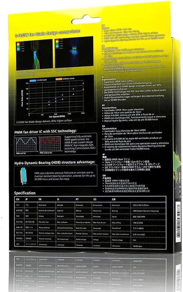 Performance Rotational speed (min): 600 RPM Rotational speed (max): 1600 RPM Noise level (high speed): 24.7 dB Type: Cooler Fan diameter: 14 cm Compatible processor series: Not supported Maximum airflow: 109.55 cfm Mean time between failures (MTBF): 50000 h Design Colour of product: Black, Yellow Technical details Noise level (high speed): 24.7 dB Type: Cooler Fan diameter: 14 cm Compatible processor series: Not supported Maximum airflow: 109.55 cfm Connector (s): PWM-4pin Bearing technology: HDB Power Voltage: 12 Colour Colour of product: Black, Yellow Weight & dimensions Width: 145 mm Depth: 145 mm Height: 25 mm Endurance Mean time between failures (MTBF): 50000 h Other features Connector (s): PWM-4pin Bearing technology: HDB Air pressure: 2.91 mmH2O