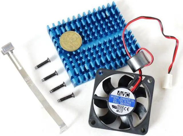 Taiwan AVC ball bearing 12V 0.15A 5cm 5015 fan aluminum alloy radiator, including pressure plate and heat conducting gasket The original Taiwan AVC aluminum alloy radiator, including pressure plate and heat conduction gasket, is equipped with AVC ball bearing 12V cooling fan. The fan and cooling fin can be used as a whole or separated separately for other purposes The fan is a ball bearing 7 blade high efficiency fan with large air volume and good durability