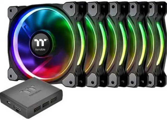 Thermaltake Riing Plus 12 RGB TT Premium Edition 120mm Software Enabled Circular 12 Controllable LED Ring Case/Radiator Fan - Five Pack - CL-F054-PL12SW-A Thermaltake combines the patented gorgeous LED light with cutting-edge technology to deliver a brand new experience of using PC cooling, Thermaltake Riing Plus 12 LED RGB Radiator Fan TT Premium Edition. A 120mm high-static pressure fan with a patented 16.8 million colors LED ring and 12 controllable single LEDs, the Riing Plus 12 RGB features compression blades, hydraulic bearing and a digital fan controller, and can be controlled by the patented Riing Plus RGB Software. Cool your system with high performance Thermaltake Riing Plus 12 RGB! Features: Patented LED Design: Featuring 12 controllable single LEDs, the built-in LED ring can paint your build with 16.8 million colors. Patented Riing Plus RGB Software & App: Monitor the fan performance, adjust the fan speeds, and customize the lighting effects for up to 80 fans with Thermaltakes patented Riing Plus RGB Software and an exclusively designed mobile app. 9 Fan Blade Design: Generate higher airflow without compromising on ultra-silent operation. Hydraulic Bearing with Low-Noise Design: The hydraulic bearing self-lubricate feature lowers operation noise while improving thermal efficiency. The seal cap prevents lubricant leakage and extends the lifespan of the unit. Anti-Vibration Mounting System: In-mold injection anti-vibration rubber pads provide a hassle-free usage with 80% protection coverage for all corners. Specification: Fan Dimension: 120 x 120 x 25 mm Interface: USB 2.0 Connectors (9 Pin) Fan Started Voltage: 9V Fan Rated Voltage: 12V & 5V Rated Current: Fan 0.15A (One Fan) Power Input: 12V 9W ; 5V 14.5W (Fan x 5) Fan Speed: 500-1500 RPM Max Air Pressure: 1.54 mm-H2O Max Air Flow: 48.34 CFM Noise: 24.7 dB-A Life Expectation: 40,000 Hrs, 25C Weight: 160g Support Please visit our website or search "Thermaltake Support" for any assistance.
