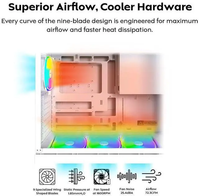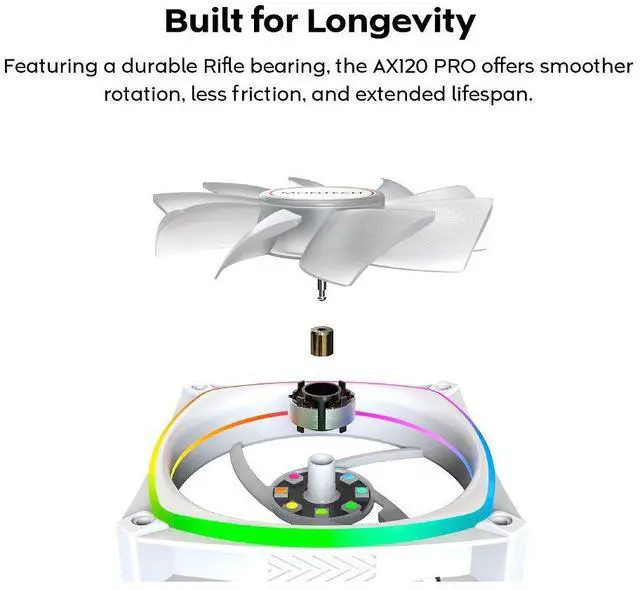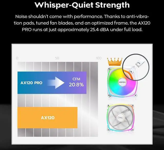 The AX120 PRO builds on the legacy of the original AX series, long established as the cooling backbone of MONTECH's flagship cases and standalone builds alike. This upgraded PRO version refines that proven DNA with enhanced airflow, quieter operation, and radiant design, turning reliable cooling into a showcase of power and elegance.