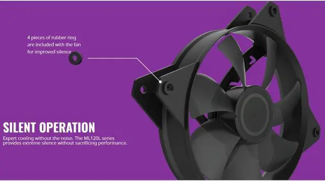 Features: Silent Operation Expert cooling without the noise. The ML120L series provides extreme silence without sacrificing performance. 4 pieces of rubber ring are came with the fan for better silent effect, while rifle bearing structure offer 280, 000 hours long life and quite operating noise at 25dBA.
