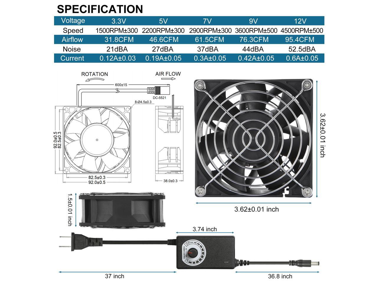 - SPECIFICATION: Size: 92x92x38mm;3.62x3.62x1.5inches | Dual Ball Bearing | Voltage: 3.3-12V | Current: 0.12-0.6Amp | Air Flow: 31.8-95.4CFM | Noise: 21-52.5dBA | Connector: DC 5.5x2.1mm Female.