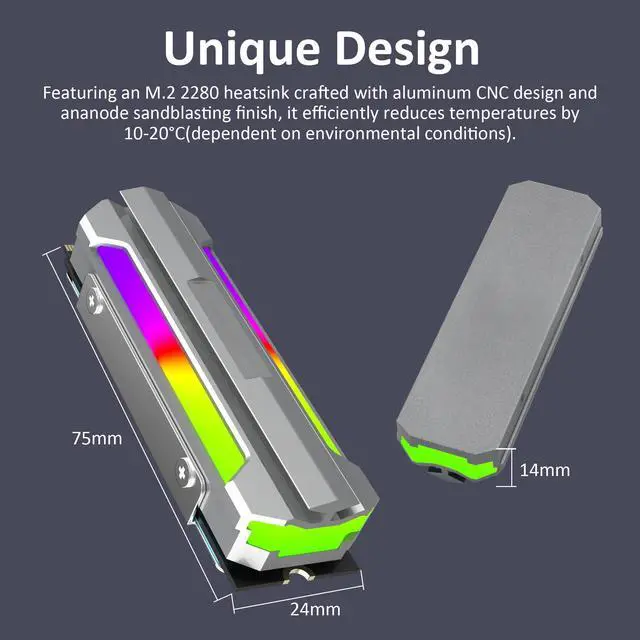 Innovative Design: M.2 2280 heatsink boasts an aluminum CNC design and anode sandblasting, effectively reducing temperatures by 10-20°C , enhances your computer's performance.