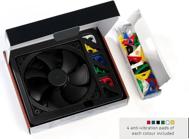 The NF-A14 PWM chromax.black.swap comes with 4 black, white, red, blue, green and yellow NA-AVP1 anti-vibration pads respectively. By combining the various colours with black or leaving off the pads on one side, the fan can be coordinated with most popular build colour schemes out of the box. Additional NA-SAVP1 sets for outfitting both sides in one colour can be purchased separately.