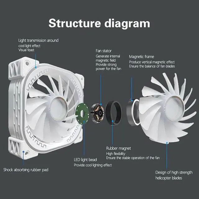 Blade Design: The unique blade configuration offers a powerful air pressure. Scientific air channel design in the frame reduces noise caused by airflow turbulence.