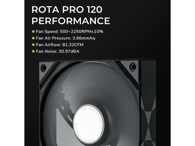 - ROTA PRO 120 120mm case fan delivers 3.66mmAq static pressure and concentrated 81.32CFM airflow. Combined with a stable three-phase six-pole motor features maximum 2250RPM rotating speed, which gives an efficient cooling air channel in PC build