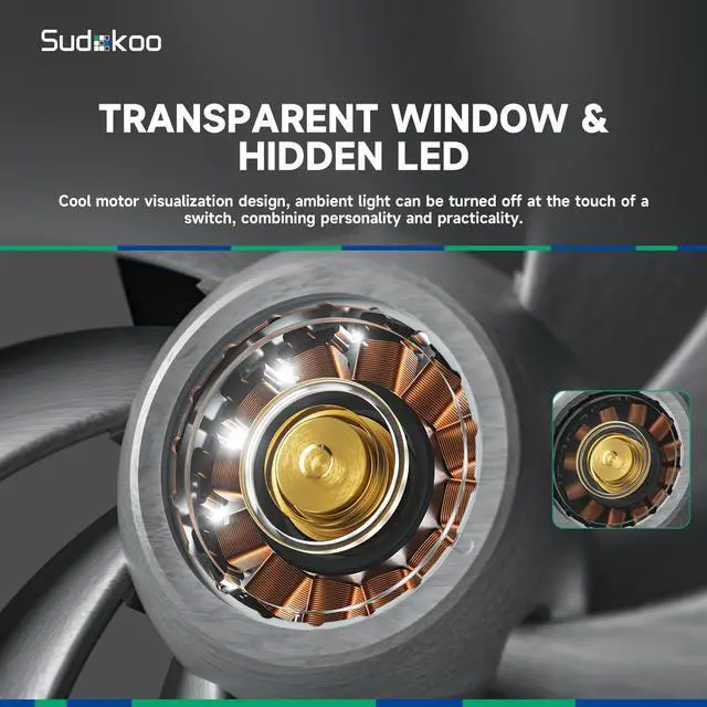 - Subtle white LED inside each fan (manually switchable)