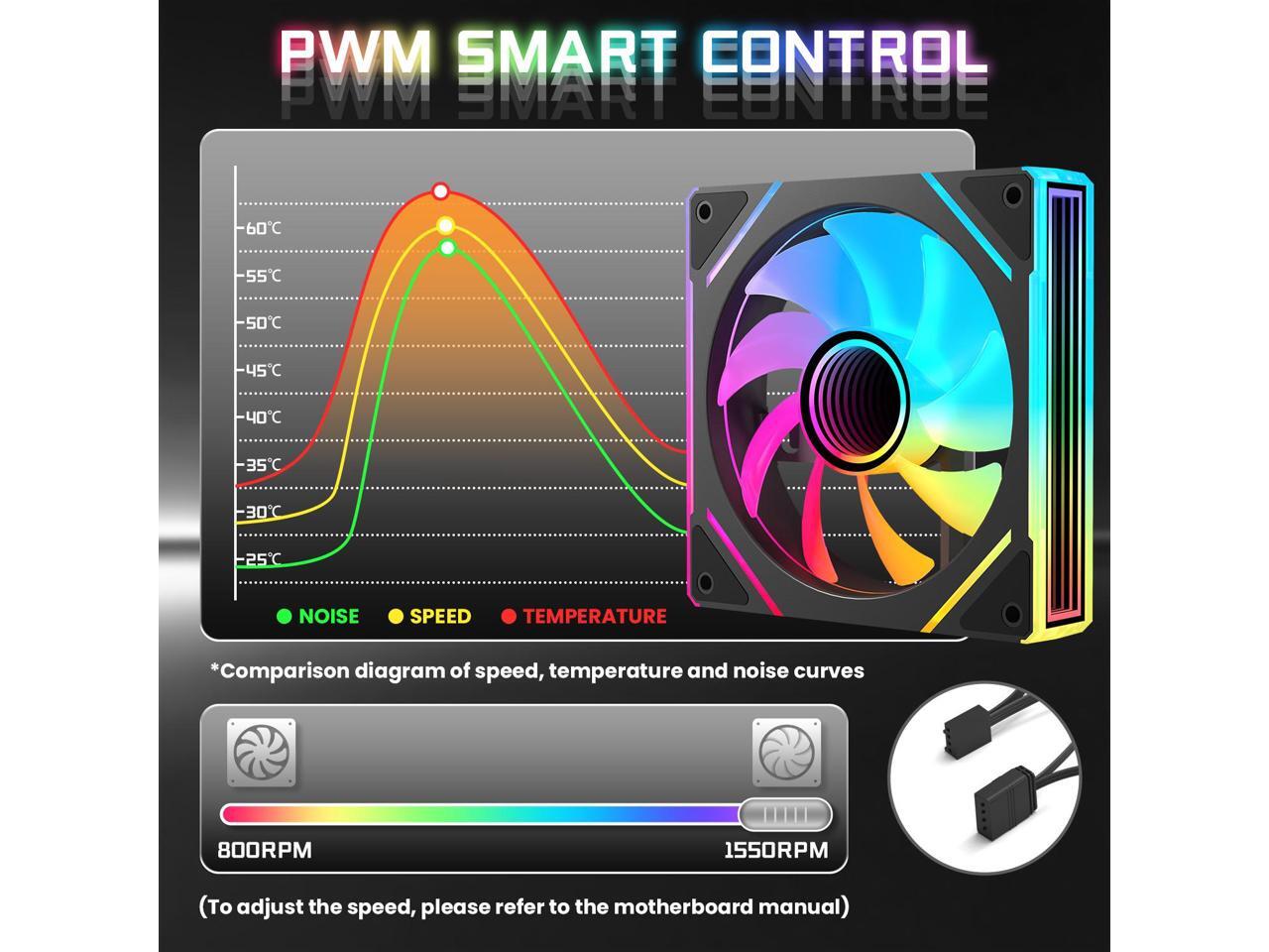 7 Pack ARGB Fans, 4 forward fan +3 reverse fans Intelligent temperature control (PWM), Fan Speeds Up to 1550 RPM with 28 LED Lights,Black