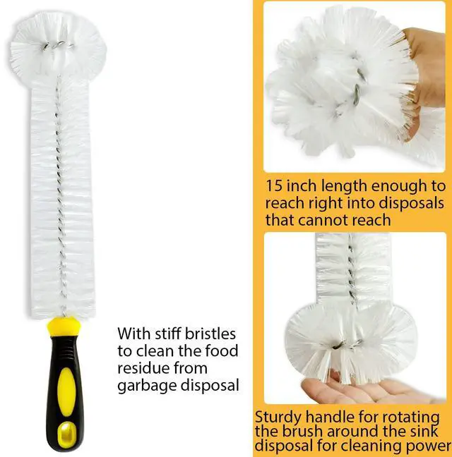 15inch length to reach right into sink disposals and reach in places where your hand or other brushes cannot to touch, fits into any disposer channel to break up nasty gunk and caked on debris
