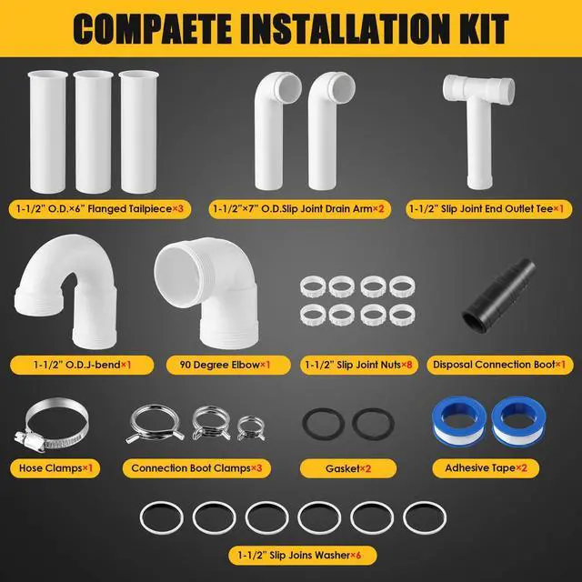 Package Includes: Flanged Tailpieces (3x) Connects sink drains to the plumbing system, ensuring efficient water flow. Slip Joint Drain Arms (2x) Provides flexibility for connecting dual sink drains. Slip Joint End Outlet Tee (1x) Merges drain lines, directing wastewater efficiently. 90-Degree Elbow (1x) Allows smooth directional changes in the drain system. OD Wall Drain Trap (1x) Prevents sewer gas from entering while ensuring proper drainage. Connect Nuts (6x) & Washers (8x) Provides a secure, leak-proof seal at all connection points. Rubber Connection Boot (1x) Creates a tight, vibration-resistant fit for garbage disposal connections. Hose Clamps (4x total) 1 standard clamp and 3 reinforced double wire spring clamps for added durability and stability.