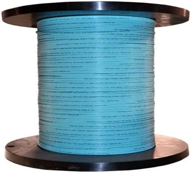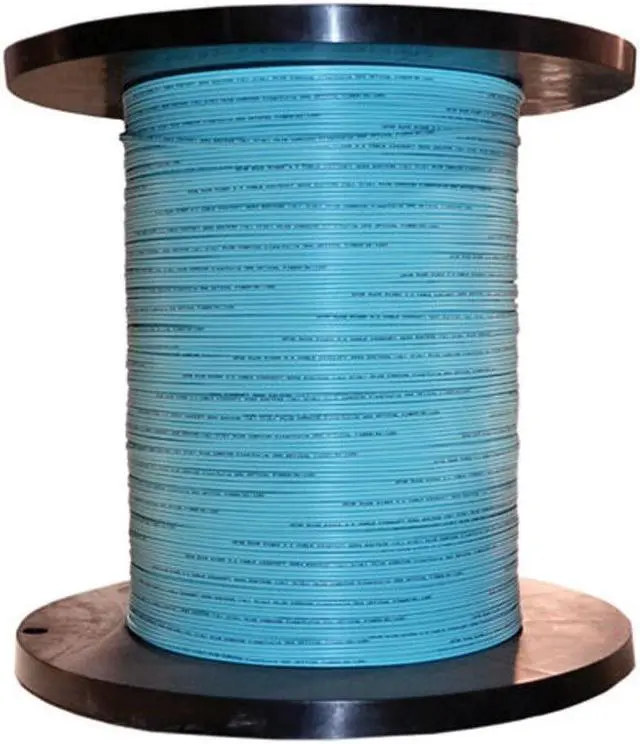 This is an aqua bulk 1000 foot spool of plenum fiber optic distribution cable intended for large installations of short range runs at 10 Gigabit speeds. It is composed of 2 multimode fibers (50 micron core) inside an Aramid yarn wrapped in a aqua PVC outer jacket. Multimode fiber is optimized to work with fiber optic equipment using light wave lengths of 850nm (nanometers) or 1300nm. The cladding diameter is 125 microns. The Graded-Step core and cladding of our aqua bulk 50/125 distribution fiber optic cable is constructed using a high quality multimode fiber that is compliant with TIA/EIA 455-220A and IEC 60793-1-49.