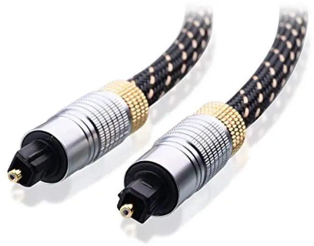 cable matters 2-pack toslink cable (toslink optical cable/digital optical audio cable) 6 feet with metal connectors and braided jacketHeavy duty Toslink Digital Audio Cable connects your Blu-Ray player, satellite DVR, CD player, Sony Playstation, Xbox 360, or other device to your digital audio video receiver. Premium Toslink cable engineered with durable PVC layers and braided jacket increases durability and protects the cable from nicks, cuts, and kinks. Polished heavy duty metal connectors and gold plated tips provide a secure and corrosion free connection. Connection Notes - Connector 1: Optical Digital Male - Connector 2: Optical Digital Male - Remove protective rubber tips prior to installation Package ContentS 2x Toslink Digital Audio Cable in 6 Feet Warranty Limited Lifetime Warranty and Product Support
