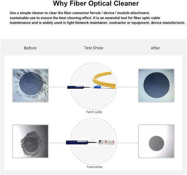 Dirty connectors cause a major percentage of fiber optic network failures and sometimes even damage the fiber optic. The most simple prevention is to clean connectors. Our fiber optic cleanser, just one motion to clean your fiber connectors, protect your fiber optic network easily and consistently. This 1.25 mm One-Push Fiber Optic Cleaning Pen is great for quickly removing dirt, dust, oil and grease from optical fiber adapters. It is designed to clean LC and MU connectors. They are great at cleaning hard-to-reach areas, ferrule end-faces and inside the plug within fiber optics connectors.