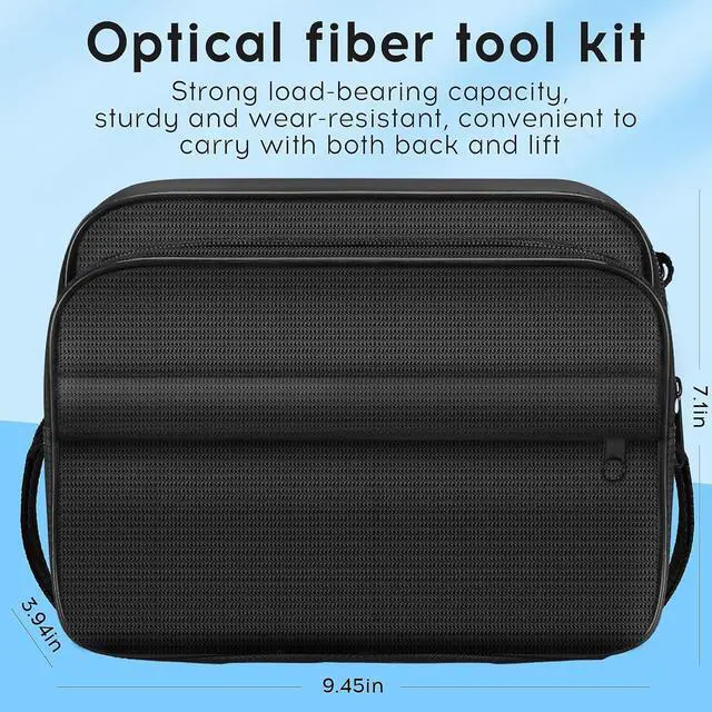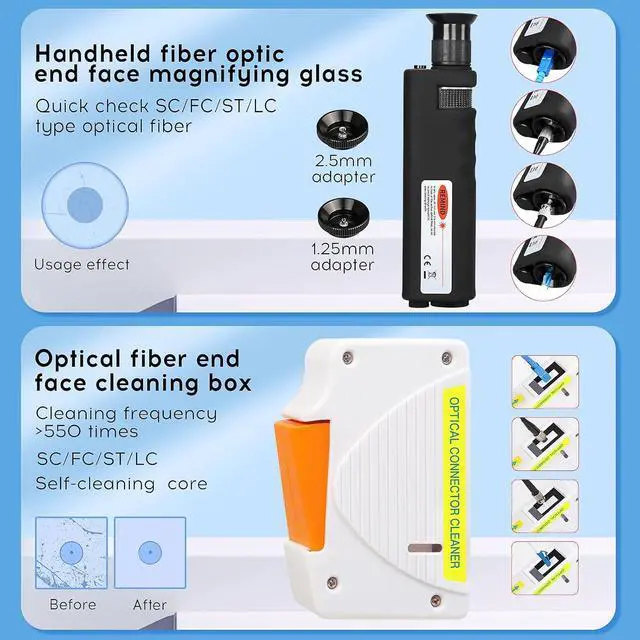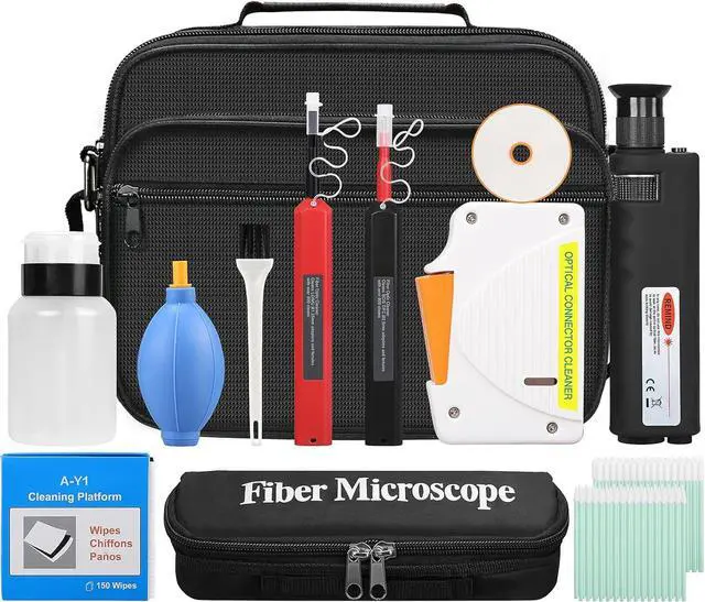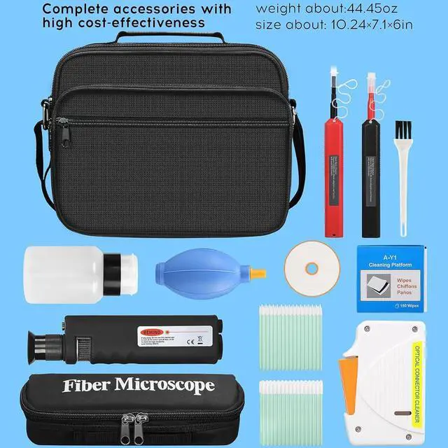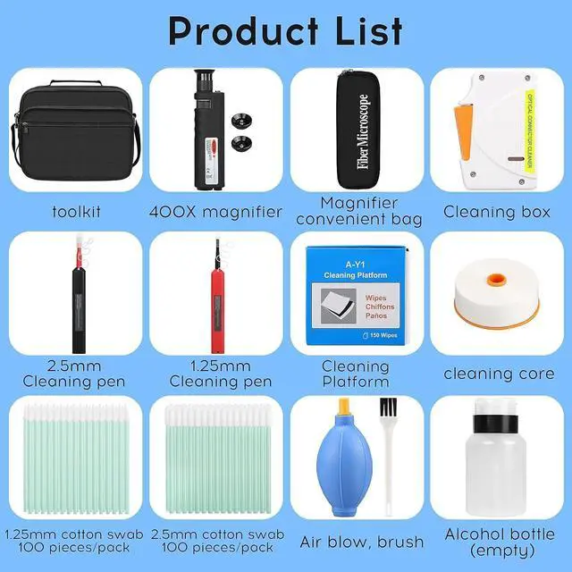 13 in 1 built-in: fiber optic magnifying glass, cleaning box and replacement core, SC/LC/MPO cleaning pen, 1.25/2.5mm cleaning rod, cleaning paper, cleaning bottle, air blow, brush, tool bag