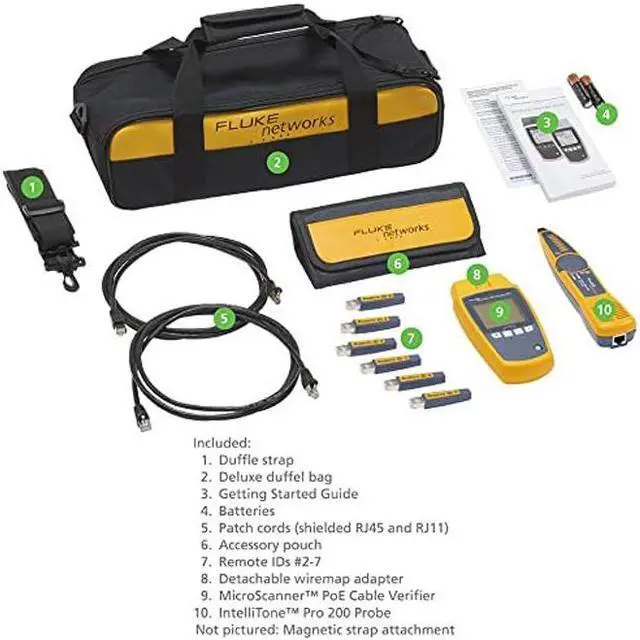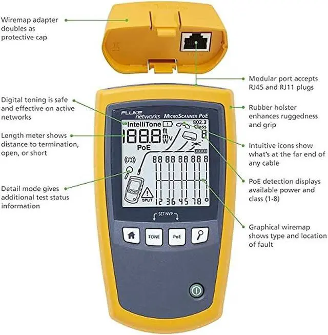 Test voice/data/video cables with integrated RJ45 which support low voltage testing with no need for adapters, ensures high quality installations and quick troubleshooting in active network environment, measures length (460 meter or 1500 feet with resolution to 0.3 meter or 1 foot), wire map to TIA 568A/B standards, remote ID locators (sold separately)