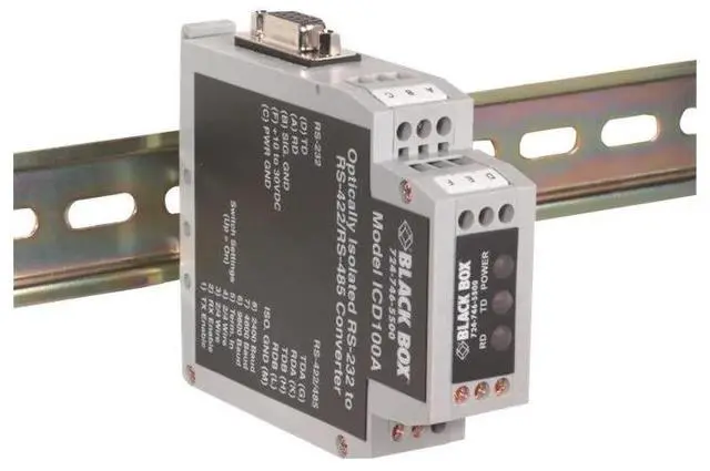 Black Box ICD100ABrand NewIncludes 1 Year WarrantyProduct # ICD100ARS-232 to RS-422/RS-485 DIN Rail Converter Optically isolates and converts unbalanced half- or full-duplex RS-232 signals to optically isolated and balanced full-duplex RS-422 or 2-wire half- or 4-wire full-duplex RS-485.