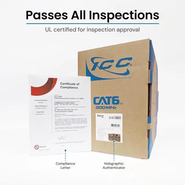 NATIONAL ELECTRICAL CODE (NEC) COMPLIANT: Built with 100% annealed solid bare copper conductors, meeting NEC Section 800.179, which mandates that "Conductors in communications cables, other than coaxial, shall be copper." Rated for 75°C and 300V, ICC cables ensure stable network communications while reducing fire hazards.