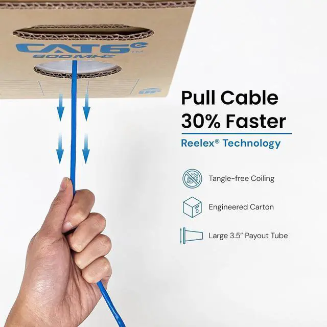 REELEX TANGLE-FREE TECHNOLOGY: The 1000-foot (305-meter), riser-rated, solid bare copper bulk Ethernet cable, packaged in a REELEX II tangle-free pull box, eliminates unwiring hassles and saves valuable time. Sequential footage markings along the jacket facilitate precise length determination and easy usage tracking.