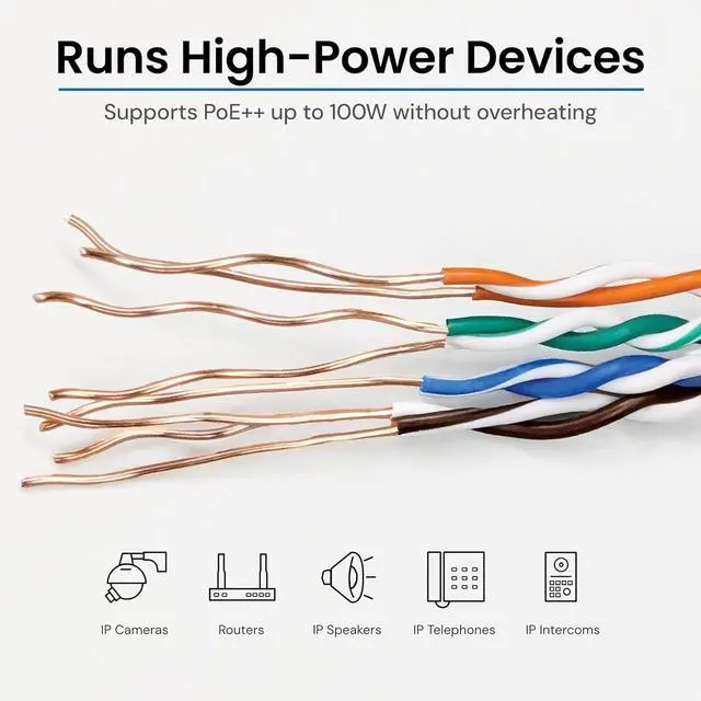 PoE++ RATED NETWORK CABLE FOR POWERING DEVICES: This Cat6e CMR riser-rated UTP bulk Ethernet cable with 4 twisted pairs (8 conductors) supports up to 100W Power over Ethernet (PoE++), making it ideal for powering devices such as security cameras, webcams, and other networked equipment. The cable supports frequencies up to 600MHz and is ETL and UL listed, ensuring reliable performance and safety.