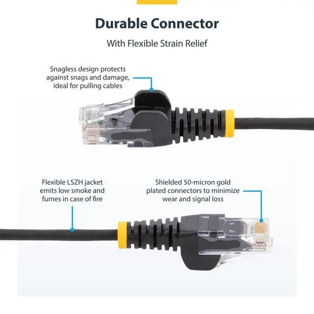 This cable features snagless connectors that protect the RJ45 clips during installation, reducing snags or breakage when routing through narrow gaps or in between devices.