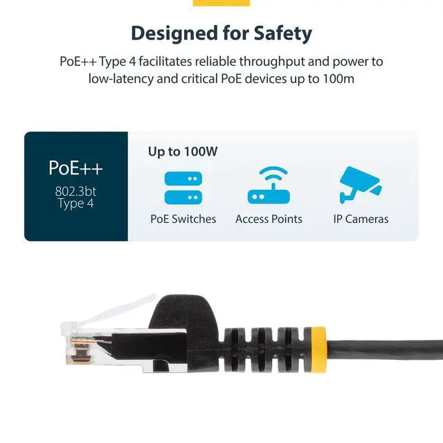 The Slim CAT6 patch cable is tested to comply with ANSI/TIA 568 C.2 requirements for guaranteed Cat6 performance. The cable is Fluke Tested to ensure minimal Near-End Crosstalk (NEXT) and Retun Loss (RL). Reliably deliver up to 100W of PoE++ to power a remote networking devices, including PoE switches and boardroom cameras. This Slim Cat6 Patch Cable complies with IEEE 802.3bt Type 4 PoE++ specifications.