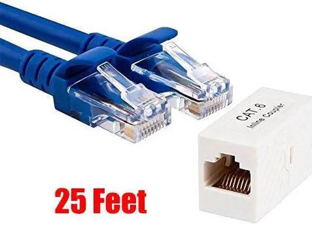 Comes with a 25 ft blue Category 6 Ethernet cable AND an Inline Cat6 Coupler. 25FT 24AWG Cat6 550MHz UTP Ethernet Bare Copper Network Cable - Blue