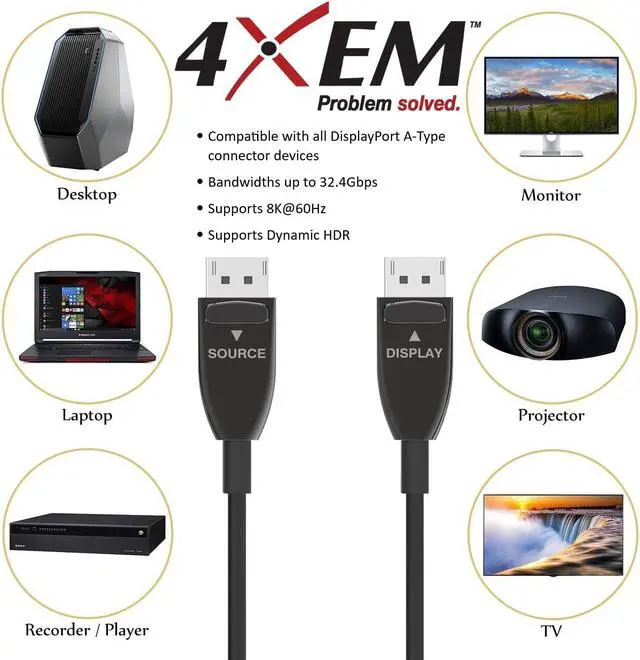 4XEM 15M 50FT HIGH SPEED ACTIVE OPTICAL FIBER DisplayPort 1.4 CABLE-8K@60HZ 4K@120HZ 7680 X 4320 4XEM DisplayPort 1.4 AOC cables are completely compatible with all DisplayPort A-Type connector devices. All our 8K Fiber DisplayPort cables support bandwidths up to 32.4Gbps and resolutions as high as 8K@60Hz. 4XEM's UHD platinum fiber optic 8K DisplayPort cable will easily connect all your high definition A/V devices. Our 8K fiber optic DisplayPort 1.4 cables are perfect for your home theater, conference call, high definition video, digital signage etc. Experience incredible detail with 8K HDR (High Dynamic Range). Extends the traditional copper wire transmission distance of DP.