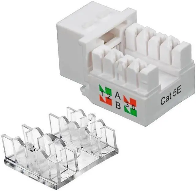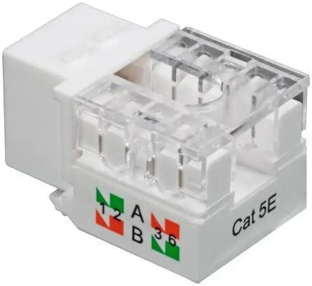 NavePoint RJ45 Keystone Jacks are standard size for use to connect solid 23 or 24 AWG cables into standard patch panels or wall plates with keystone blanks. The 110-type terminations are color-coded for both T568A and T568B wiring schemes and the 90-degree right angle connection allows for easy termination. Dual IDC modules can use 110 or Krone impact tools and come with dust caps to assist with cable strain relief. Constructed of high-impact, fire-retardant high temperature thermoplastic with gold-plated contacts, these Keystone Jacks meet or exceed Category 5e performance in compliance with the TIA/EIA 568-C.