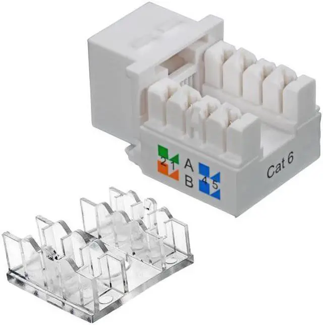NavePoint RJ45 Keystone Jacks are standard size for use to connect solid 23 or 24 AWG cables into standard patch panels or wall plates with keystone blanks. The 110-type terminations are color-coded for both T568A and T568B wiring schemes and the 90-degree right angle connection allows for easy termination. Dual IDC modules can use 110 or Krone impact tools and come with dust caps to assist with cable strain relief. Constructed of high-impact, fire-retardant high temperature thermoplastic with gold-plated contacts, these Keystone Jacks meet or exceed Category 6 performance in compliance with the TIA/EIA 568-C.