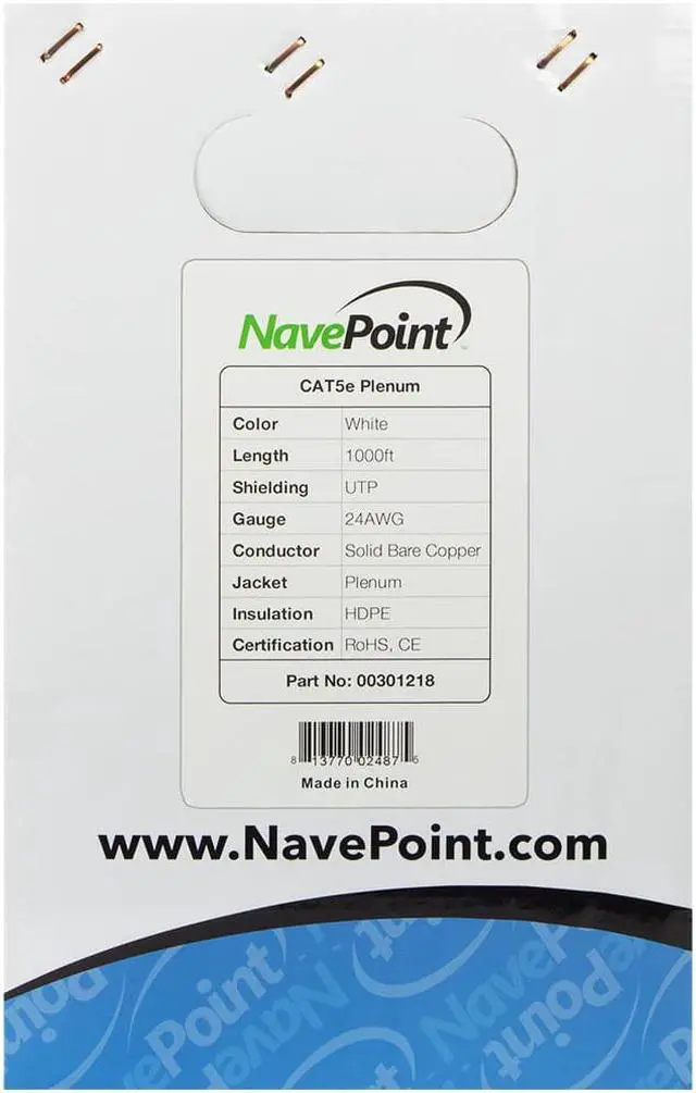 NavePoint's Category 5e CMP rated UTP Bulk Ethernet Cable is the perfect solution for wiring your home or office and can be used in wall, between floors and in plenum spaces. Gigabit ready, this cable is designed to provide superior performance for your high bandwidth applications including computers, routers, VoIP phones, IP cameras, printers, gaming consoles, routers, ethernet extenders, switch boxes, and PoE devices. Made from professional grade materials, this cable was made to meet or exceed ANSI TIA/EIA 568.2 standards. This cable features 24AWG and a diameter of 5.10 mm and is available in a variety of lengths and colors.
