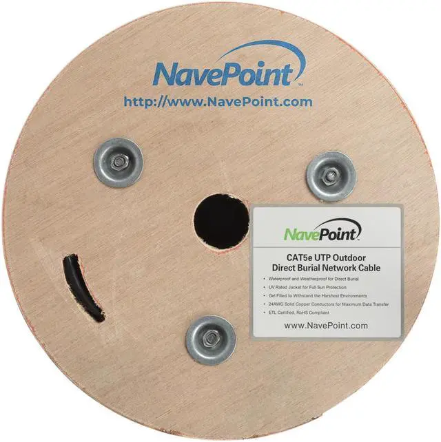 NavePoint brings you high quality, bulk rolls of Superior Outdoor Ethernet cable at unparalleled value. This high-performance bulk cabling is perfect for your custom network installation projects. Pure Copper conductors provide better performance over longer cable runs. Gel Fitted construction can withstand the toughest and wettest of environments. UV Rated jacket for full sun protection. NavePoint Superior Outdoor Cat5e cables are made of 100% bare copper wire, tested up to 350 MHz. It is ETL listed.