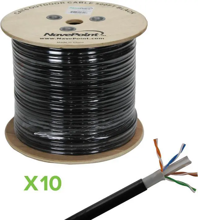 NavePoint's Cat6 Outdoor UTP (unshielded twisted pair) Direct Burial Ethernet Cable with true 23AWG/ 0.57 mm solid conductor is ideal for your indoor/outdoor voice, data, video and security networking applications. This waterproof, Indoor/Outdoor LDPE cable features 8 conductors (4-Pairs) of solid bare copper with an HDPE (High Density Polyethylene) insulation and an LDPE rated PVC Jacket. This cable has been tested up to 550 MHz and is suitable for 10Base-T, Fast Ethernet (100Base-TX), Gigabit Ethernet (1000 Base-T or 1000 Base-TX) and 10-Gigabit Ethrnet (10GBASE-T). This listing is for a 10-pack of this item.