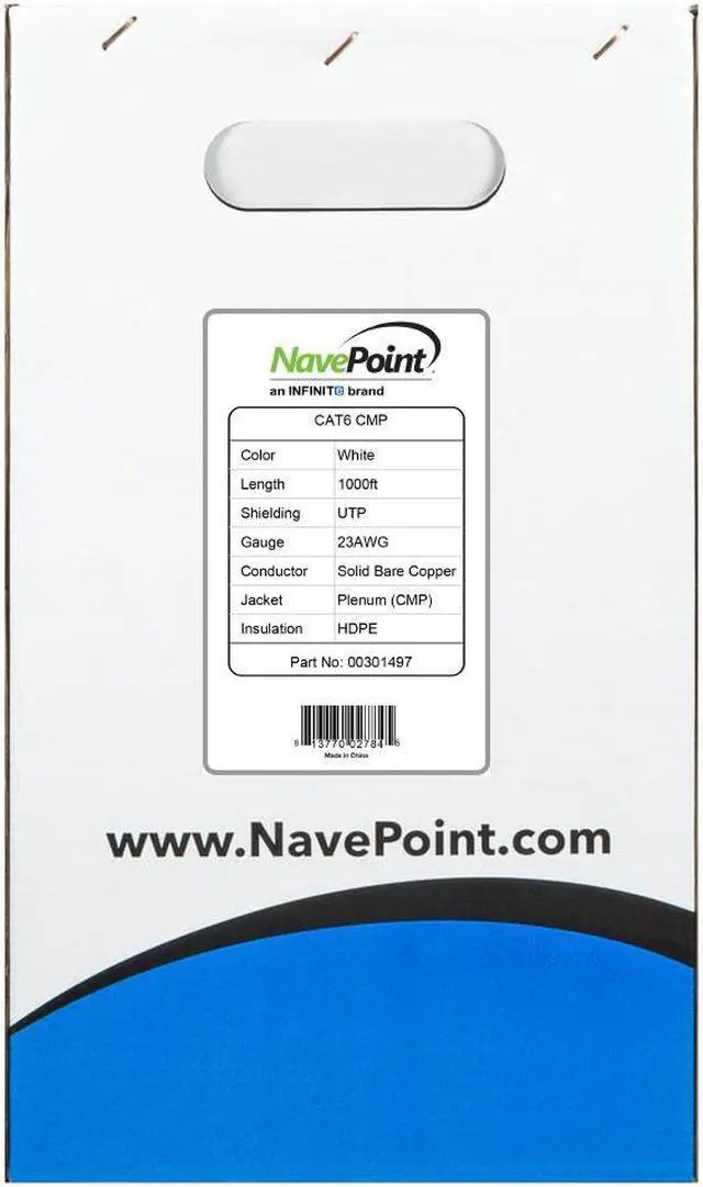 The NavePoint CAT6 UTP bulk Ethernet cable is Gigabit ready to provide superior performance for your indoor high bandwidth applications. The CAT6 Ethernet cable features fire retardant PLENUM-rated jackets that are designed to meet rigorous fire safety test standards, making this cable the choice for your installs.