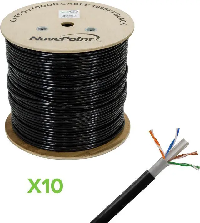NavePoint's Cat6 Outdoor UTP (unshielded twisted pair) Direct Burial Ethernet Cable with true 23AWG/ 0.57 mm solid conductor is ideal for your indoor/outdoor voice, data, video and security networking applications. This waterproof, Indoor/Outdoor LDPE cable features 8 conductors (4-Pairs) of solid bare copper with an HDPE (High Density Polyethylene) insulation and an LDPE rated PVC Jacket. This cable has been tested up to 550 MHz and is suitable for 10Base-T, Fast Ethernet (100Base-TX), Gigabit Ethernet (1000 Base-T or 1000 Base-TX) and 10-Gigabit Ethernet (10GBASE-T). This listing is for a 10-pack of this item.