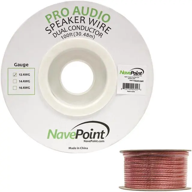 NavePoint's 12 Gauge Speaker Cable is the perfect solution for wiring your home, car, or office stereo system. Connect your speakers to amplifiers or receivers. Made from professional grade materials, this cable features 102 strands of 0.16 mm copper clad Aluminum. This cable is available in bulk 100 ft length with a clear PVC jacket and comes on a spool for easy storage and convenient use. Pack of 4