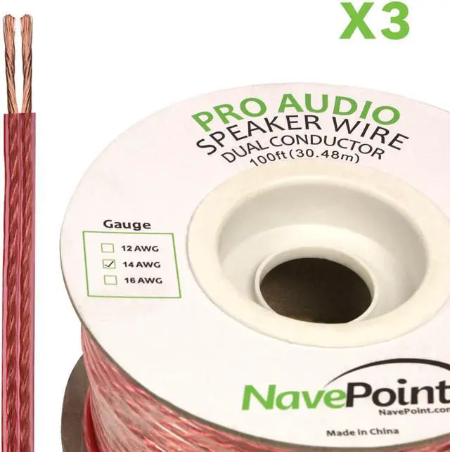 NavePoint's 14 Gauge Speaker Cable is the perfect solution for wiring your home, car, or office stereo system. Connect your speakers to amplifiers or receivers. Made from professional grade materials, this cable features 80 strands of 0.16 mm copper clad Aluminum. This cable is available in bulk 100 ft length with a clear PVC jacket and comes on a spool for easy storage and convenient use. Pack of 3