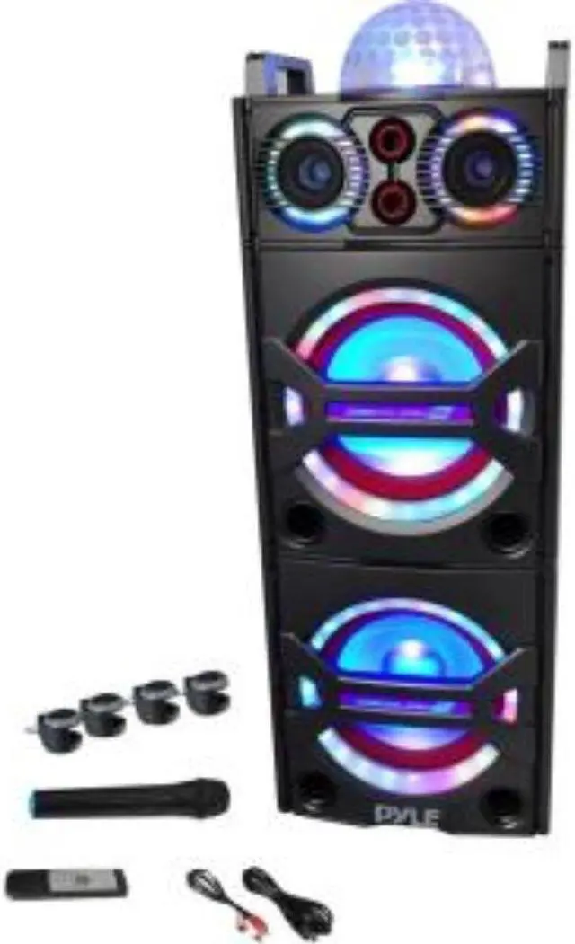 Pump up the party with the Pyle Karaoke Speaker Systems. Enjoy plenty of music streaming options that will add life to any occasion. Included wireless microphone makes it perfect for sing-along karaoke parties, Bluetooth audio streaming plays all of your favorite songs wirelessly, and the built-in flashing DJ party lights add visual effects to the high-powered sound! Use the system at home, on stage or in the auditorium -- it's perfect for all of your audio and crowd control needs. Convenient carry handle and rolling wheels allow you to easily transport the speaker system to quickly post up and party! Additional features include, USB & SD Memory Card Readers, FM Radio along with the ability to connect additional microphones.