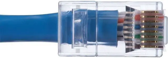 Open-end Feed-Thru connectors offer several advantages over standard closed end connectors. Conductor order can be verified prior to crimping. Conductors that feed-thru the connector are inserted far enough to be pierced by the pin below. The cable can be pushed or pulled into the connector to ensure that the twisted pairs are as close to the pin contacts as possible and that the jacket is seated beyond the primary strain relief for a secure connection. A patent pending design enables conductors to be cut flush with the end face of the connector when used with the FT-45 tool.