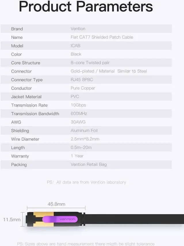 Cat7 Ethernet Cable, Vention Flat High Speed 10 Gigabit LAN Network Patch Cable with Clips, Faster Than Cat6 Cat5e, Shielded RJ45 Connectors for Xbox One, Switch, Router, Modem, Printer- Black/30ft