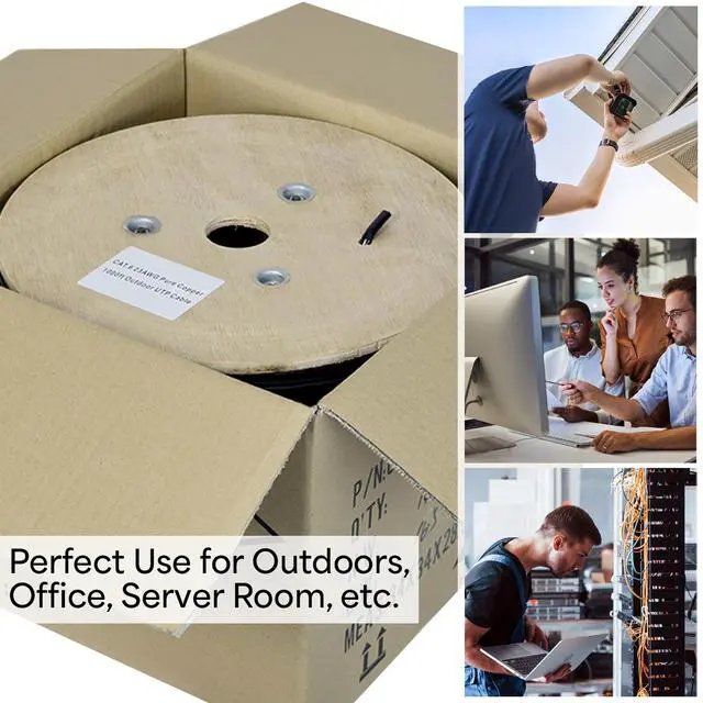 Cat6 UTP (unshielded twisted pair) PURE COPPER 23 AWG bulk ethernet cable is ideal for your network installation. Case contains 1,000 ft of wire in waterproof shielding for outdoor direct burial.This cable is suitable for 10BASE-T, 100BASE-TX (Fast Ethernet), 1000BASE-T / 1000BASE-TX (Gigabit Ethernet) and 10GBASE-T (10-Gigabit Ethernet). It is connector free, giving the user the freedom to customize the length, wiring, and application.