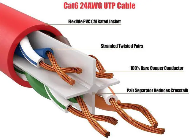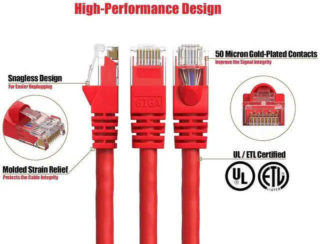 Cable Leader Cat6 UTP Ethernet Network Patch Cable Snagless 24AWG Bare Copper, Red delivers reliable high-speed networking for your home or office with 550 MHz bandwidth supporting data transfers up to 1 Gigabit per second. This premium ethernet cable features 24AWG bare copper conductors with gold-plated RJ45 connectors that resist corrosion and ensure clear signal transmission for consistent network performance. The snagless molded boot design protects the connector's locking tab from damage during installation and removal, making it ideal for frequent use in busy network environments. Cable Leader engineered this Cat6 cable to meet UL and ETL certification standards while maintaining RoHS compliance for environmental safety.