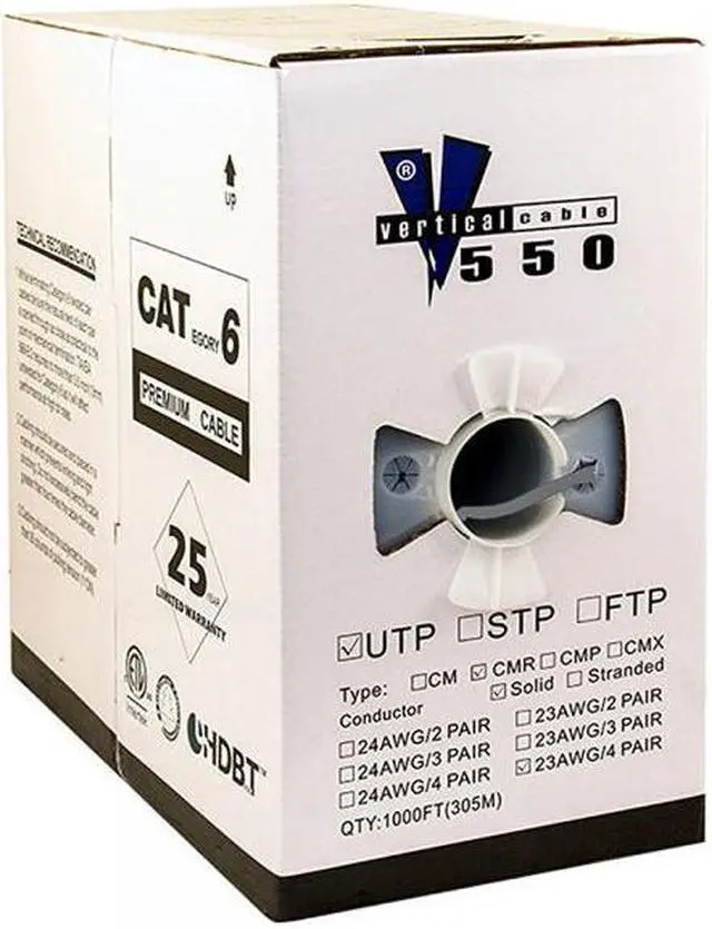 This Cat 6 unshielded twisted pair ( utp ) cable is a high performance data communication cable suitable for 550mhz high speed applications. It has excellent attenuation and crosstalk characteristics and exceeds TIA/EIA-568-C.2 specification.This ethernet cable is designed for indoor and riser network installations and is approved by ETL to be type CMR. The wires are 23 awg in size and are made of solid bare copper conductors. All 4 pairs are easily identified by color stripes. The insulation material is PE and the jacket is made of PVC. This cable is supplied in 1000 ft pull box and sequential length markings are printed on the jacket. Brand for this product is Vertical Cable.